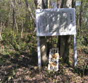 一升水から5分ほどで、山頂「本丸跡」に到着。錆びた案内板があるだけで、山頂を示す標識の類は何もない。ガイドブック(1998年発行)には「見事な眺望」と書かれていたが、さすがに10年たつと様相が変わり、周囲の木々が丈を伸ばして展望を遮っていた。現在は北側に若干の眺望を残すのみである。 |