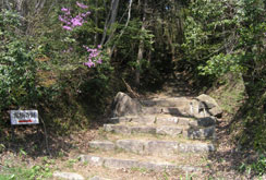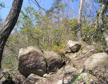 中城跡の先で道が二手に別れる。木に巻かれたテープに書いてある字は読みにくいが、右に上っているのが「尾根道」、直進が「沢道」とある。上りでは岩が露出した尾根道を行くことにした。木に遮られているが、枝越しに展望が楽しめる尾根道を5分ほどで「姫路丸」。その先で、沢道と再び合流し山頂に向かう。 |