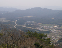 旧大朝町と千代田町の境界にある山で、戦国時代には山頂部に山城が築かれていた。1550年に毛利元就の次男吉川元春が入城した際、山頂の「本丸」をはじめ「二の丸」「池の段」「姫路丸」など、数十の砦が立ち並ぶ大規模な城塞として整備されたと伝えられる。現在、山名の正式な表記は「火野山」となっているが、古文書には「日野山」「日の山」「日山」とも表記される。これは、元春が敵対していた尼子氏の居城「月山富田城」を意識したものといわれる。地元ではいまも「日野山」が用いられることが多い。 吉川元春は、元就三男の小早川隆景と共に「毛利両川」と称される武将。学問にも秀で、尼子氏討伐の陣中において元春自身が書写した「太平記」全40巻は、原作に最も近く、ほぼ全巻が揃っていることから、古典文学研究の貴重な資料とされ、国の重要文化財に指定されている。通称「吉川本」。 (寒曳山・天狗岩からの眺め。) | |