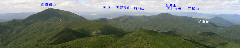 ![]() 風が強く、空気中の塵が少ないからか、遠望がよくきいた。西鳳翩山と秋吉台の間、遙かにそびえる華山、狗留孫山・・・ |