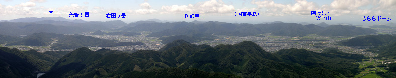 ![]() 山口市街地と防府の山々。南西に阿知須のきららドーム。瀬戸内海の彼方には国東半島が浮かぶ。 |