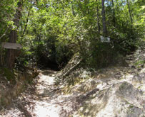 特に標識はないが道なりに進んで行き、小さな橋を渡ると、道端に「瓦小屋登山口」の標識がある。これに従い、民家の間に延びる細い道に入る。この道はセメント舗装された一本道で、雑木林の間を緩やかに登っていく。登山道としては少々物足りないかもしれないが、暑い時期にはこのくらい楽な道の方がありがたい。このまま山頂まで続いてくれたら、と思っていたが・・・ |