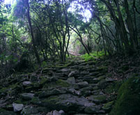 前日にテント泊した山中キャンプ場から舗装された林道を上ってゆくと、車道はすぐに途切れ地道となる。そのまま上ってゆくと、舗装された車道(金山脊振林道)の脇にとび出す。道路を横切り、登山道へ。九州自然歩道として整備された登山道は歩きやすく、薄暗い森の中でもコースは明瞭だった。 |