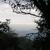 金山からは、念願だった脊振山までの稜線歩き。ブナ林は今年も紅葉には早く、緑の葉が生い茂っていた。左手(北側)には、枝越しに博多の街が垣間見える。深山幽谷の気配を漂わせるブナ林だが、意外に都市部に近い。(右)は福岡ドームのある百道あたり。 |