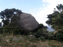 樹林帯を抜け見晴らしの良いササ原に出ると、「唐人舞」が近い。登山道から分岐して数十mほどの見晴らしの良い場所に巨岩が転がっており、その昔、唐人がここから故郷を偲んで舞ったと伝えられる。さすがに唐の国までは見えないが、博多の街は一望できる。脊振山もさらに近くなった。岩の上は狭く傾斜しており、踊るどころか体の向きを変えるのがやっと。 |