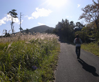 駐車場のすぐ上で道は3つに分かれている。鉄柵で閉ざされた中央右寄りの道が登山道である。乗り越えて中に入ると,放牧作業のための舗装路がしばらく続き,数軒の小屋(別荘?)を過ぎた先でススキの生い茂る地道となる。足下はススキで隠れ気味だが,踏み跡はしっかりしており,正面に見える湧蓋山を目指してまっすぐ上っていく。 |