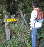 登山道は見晴らしの良い草原を出て樹林帯を抜け,すぐに林道と合流し最奥の登山口に達する。ここからの道はほぼ直登の急坂で,途中までは樹林に囲まれ展望はきかない。クヌギの木が多く,道の上にドングリがたくさん落ちていた。樹林帯は上に行くほど滑りやすくなっているので注意。 |