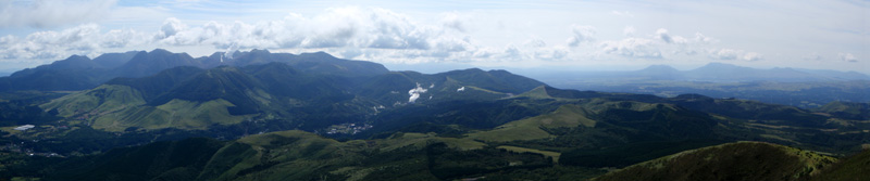 ![]() 振り返ると,高原の牧歌的な風景を取り囲むように,釈迦岳や英彦山,馬見山など,福岡県の高峰が稜線を連ねている。 高度を上げるとさらにその向こうに,三郡山や背振山,雲仙岳まで見えるようになった。 |