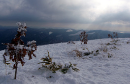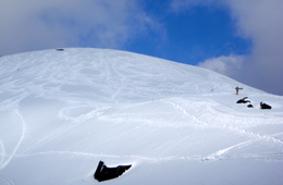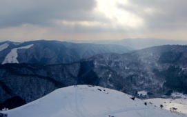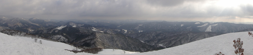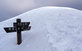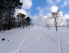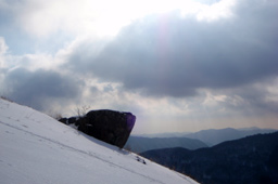 ![]() 高い木がなく吹きさらしの山頂は,積雪が少なく寒い。ときどき陽が差してきたが,体は暖まらなかった。 帰りは,ふかふかの雪の中を転がるように,まっすぐ駆け下りた。 |