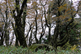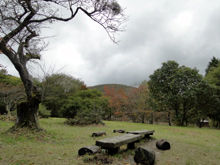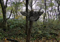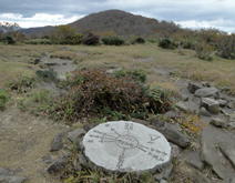 ススキが刈られ,早くも冬の装いを見せる大膳原。新たに方位板が立てられ,山頂への道が判りやすくなった(画像の位置で直進すると野営場方面である)。天気が悪く,紅葉も期待できないので,山頂から池の原の様子を見てから,周回するかどうか決めることにした。・・・そして,山頂から見下ろした池の原の紅葉は,やはり今ひとつ。周回はパスして大膳原まで折り返し,御陵に向かった。