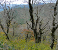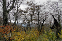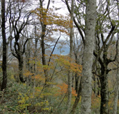 紅葉が遅れていた他の山々とは逆に御陵山頂付近は少しピークを過ぎており,葉の落ちたブナの枝越しに周囲の景色が見渡せた。