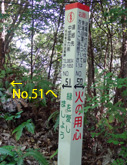 ![]() 広末コースの入口には特に標識もなく,行く先の森はうっそうと暗いので不安になるが,もともと送電鉄塔の巡視路なので踏み跡ははっきりしており歩きやすい。急な上りにはプラスチックの階段までつけられており,やや面白味に欠けるが・・・苦もなく尾根上の鉄塔分岐点に出る。 分岐点には中国電力の標柱が立ち,鉄塔のナンバー[50]と[51]に道が分かれているが,ここは左の[51]方面に進む。この尾根は主稜線から分かれた支尾根であり,尾根上にもその旨注意書きがあるので,進む方角を勘違いしないように。右手(東側)に視界が開けた尾根上からは,三丘ヶ岳や竜ヶ岳が望まれる。 |