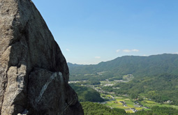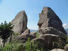 ![]() [51]方面に少し進むと視界が開け,件の51番鉄塔の足下に出る。さっき登った烏帽子岳が指呼の間。 再び樹林帯に入り,踏み跡に沿って歩いてゆくとやがて向き合った顔のような巨岩の前に出る。手前の説明板によるといずれも花崗岩で,ひとつは高さ7.9m,周囲16.1m。もうひとつは高さ8.5m,周囲19.7m。岩と岩の間は1.4m。別名を「影向石」ともいう。麓からもよく見えるだけあって,岩からの展望も良い。 |