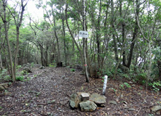 ![]() 小道は瀬戸遊歩道との連絡路で,数十m進むと開けた場所に出る。「瀬戸へ2km」の標識を見て北に向かい,起伏の緩やかな広い道を10分足らずで「スリバチ山229」に到着。道端で草をかぶってひっそり佇んでいる標識の周囲は全く展望がきかず,すぐに引き返すことにした。なお,遊歩道の途中に「見晴らしの丘」という場所(左端画像)があるが,こちらも周囲の木々が伸びて名前ほどの見晴らしは望めなかった。大城分れに戻り,展望地で少し休憩の後本浦方面へ。 |