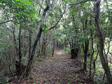 ![]() 山頂から北へ,薄暗い樹林帯の急坂を下ると開けた砂利道の脇に飛び出す。ここから右に行けば瀬川遊歩道,スカイ2は左に続いており,少し進めば再び山中へと導く標識が見つかる。この標識から海側に下れば,尾郷バス停に出られる。まずはスカイ2にとりつき,摺鉢山山頂へ向かう。こちらも薄暗い樹林帯につけられた急坂だが,よく踏まれた道で迷う心配なく高度を上げてゆく。 白浜山もそうだったが,登山道をたくさんのカニが横切ってゆく。沢ガニではなく,海辺によくいるヤツである。周囲の眺めはほとんど木々に遮られているが,かすかに聞こえる波の音ともに,海が間近に迫った低山であることを実感する。 |