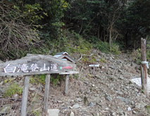 雄岳・雌岳に向かって道なりに進むと,川べりに建つ小さな神社の前に出る。これは幕末の政変期に京から長州に逃れ,この地で暗殺された攘夷派の公卿・中山忠光(1845-1864)を祀った本宮中山神社で,鳥居の前に3〜4台分の駐車スペースと,登山道の案内板がある。ここから登山開始。上りは古堂コースを使う。 |