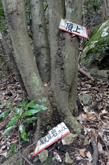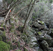 林道を離れ,尾根につけられた広く明るい道を下り,鞍部から右に折れて沢に下る。ここまでは快適であった。その後は下るにつれて踏み跡が錯綜,倒木も増えてどこを歩けばいいのか分からない場所も少なくなかった。林道ができたことで,特徴のない普通の道は利用者が減り,荒廃が進むばかりなのか。 |