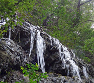 長門山地の西端にあり,旧豊北町の最高峰。登山口となる南麓の田耕(たすき)地区からは,山腹に岩壁をまとった2つのドーム状のピーク(雄岳580m/雌岳583m)が並び立つ独特の景観が望まれる。実際の山頂部はこのドームの奥にあり,あまり特徴もなく麓からはほとんど目立たない。登山道のほぼ中間点にあるゴルジュ帯(切り立った岩壁に狭まれて廊下のようになっている場所)と,そこに流れ落ちる小さな滝「白滝」がこの山の見どころであり,夏は渓谷の涼を求め,冬は岩壁に垂れ下がる巨大な氷柱を見に,多くの登山者が訪れるところであったが,近年は開発が進み,田耕から山腹を巻いて長門市油谷に抜ける広域林道に加え,山頂部には風力発電用の巨大な風車が立ち並び,目を覆いたくなる自然破壊の惨状である。 古くからの登山道は今も残ってはいるが,林道を利用してゴルジュ帯手前や山頂直下までショートカットできるようになったためか,かつてのメインルートだった「ぬたが迫コース」は荒廃が進み,「古堂コース」の下部も踏み跡が不明瞭となっている。ゴルジュ帯は比較的明瞭だが,白滝を越えてから山頂への上りに取り付くまでの経路も標識類が少なく分かりにくい。古いガイドブックを頼りに登ると非常に苦労する山である。 |