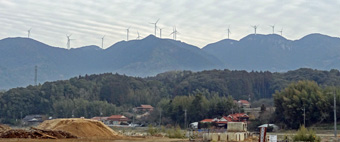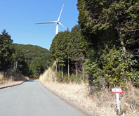 植林帯を下って合流した林道には山頂方面への案内標示はなく,間違えて上り方向に歩いて行ってしまった。舗装路の脇に立つ巨大な風車,「関係者以外立入禁止」の標示と車止めばかりが目に付き,山頂への入口標示はどこにもない。不審に思ってルート図を見直し,やっと道を間違えたことに気づいて引き返した。往復で約20分のロス。舗装路のすぐそばで3頭の鹿に出会った。 |