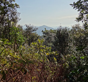 9年ほど前の記事では「(樹木が伐採され)展望が大きく開けた」と書かれていた山頂は,木々の丈が伸びて再び眺めを遮りはじめていた。北側に向津具半島の一部,南東方向に一位ヶ岳の山頂部が見えるのみである。 |