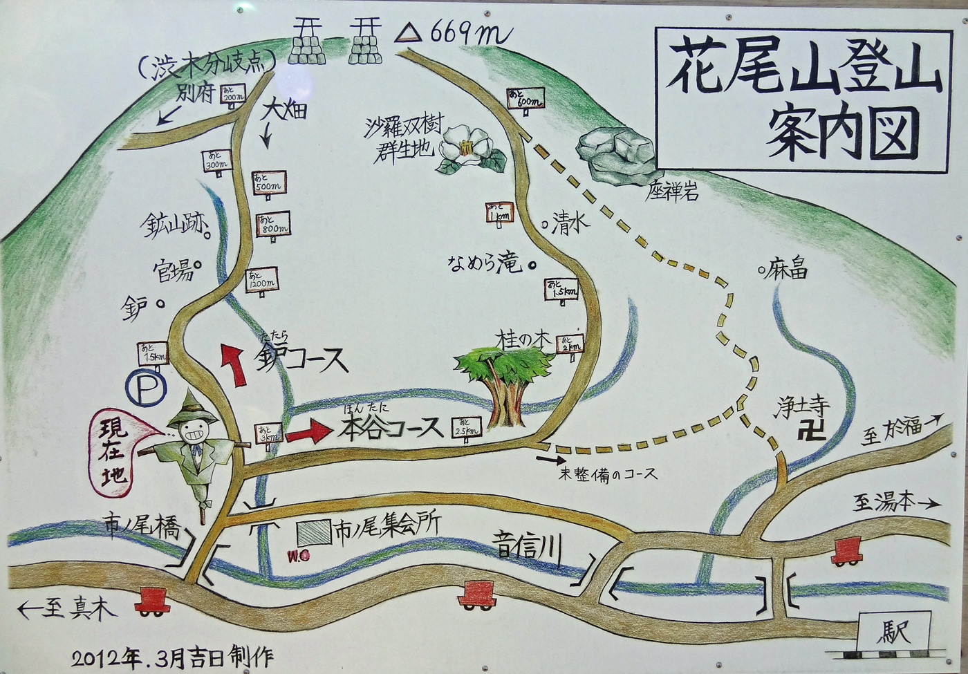 駐車場から数百mで案山子の立つ分岐点に出る。従来の「市ノ尾コース」は「鈩(たたら)コース」と命名され,そのまま直進。2009年頃?に新設された「本谷コース」は右手の道に入る。少し距離は延びるが,上りは本谷コースを利用することにした。(案内図をクリックすると拡大表示します) |
