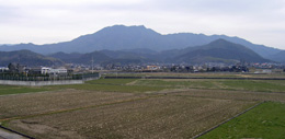 ![]() 上り道は主尾根に合流すると傾斜が緩やかになり,標高550m(西端ピーク)の展望台に出る。南側が切り開かれ,周東と玖珂の町並みを眼下に望むことができる広場で,手作りのベンチ(丸木)が置かれており休憩にちょうどいい。この日は黄砂のせいか,遠望はあまりきかなかった。 |