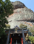 不動岩から下の斜面はミカン畑となっており,山麓の浄光寺から細い車道が不動岩手前までつけられている。車道終点は5〜6台程度の駐車場兼展望所。祠が置かれている不動岩の真下には徒歩1〜2分。 蒲生山山頂や展望所へ続く登山道(九州自然歩道)は,駐車場と祠の間につけられている。 |
