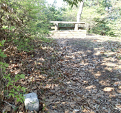 ![]() 展望所に比べ歩く人が少ないのか,木の葉に埋もれ滑りやすい道。岩場を巻きながらアップダウンの後に急な上りとなって尾根に出る。ここで再び道が分かれ,左が後不動まで「すぐそこ」の上り,右は蒲生池に続く2.3kmの下り道となる。 上りきった場所は,木々に囲まれ展望のない休憩広場。以前はここに「蒲生山」山頂を示す小さなプレートがあったらしいが,見当たらなかった。 広場の先にはさらに踏み跡が続いていたので,展望を期待して進んでみた。 |