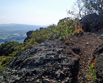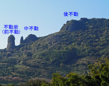 不動岩直下まで車道が通じており,不動岩越しに金峰山,有明海,雲仙などを遠望できる展望地(中不動)までは急坂を5〜10分の距離。展望地周辺は急峻な岩場となっているので足下に注意。蒲生山山頂も車道終点から800m程度と比較的近いが,展望も標識もない地味な広場となっている。この山頂からも展望の良い岩場(後不動)に出ることができるが,道が細く標識類もほとんどないので十分注意したい。
