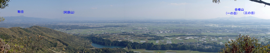 ![]() ![]() 後方は蒲生山に遮られているがほぼ360度に視界が開け,鞍岳や金峰山が遠望できた。空気が澄んでいたら有明海越しに雲仙岳も見えそう。 |