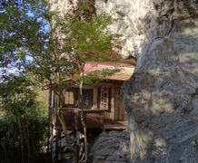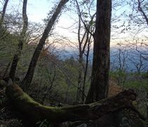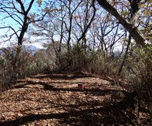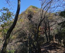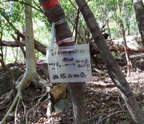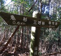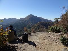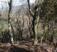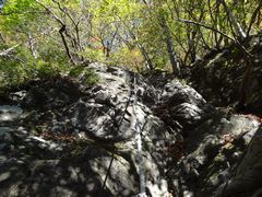 小さい表示板が木にくくられただけの二の岳山頂(・・・と思われる)を過ぎ,岩場を下って森を抜けた先に忽然と現れる三の岳。平均台のような細い岩壁が三の岳に向かって延びており,これを伝い,さらにその先の岩峰に取り付かねばならないのか・・・と引き返したい気分になったが,よく見ると登山道は岩壁の右側を下り,再び森の中へ続いておりホッとした。少し進むと,一の岳手前で分岐した「巻き道」の合流点に出会う。 | ||