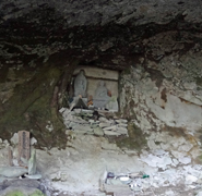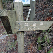 途中,四王司滝と梵字岩は素通りしたが,今まで立ち寄ったことのない「虚空蔵」と示された場所に足を伸ばしてみた。分岐標識には「100m」とあったが,その2〜3倍くらいの長い上り道の終点が広場となっており,屹立する巨岩の下には多くの石仏が祀られている。説明がないので,この場所一帯が「虚空蔵」なのか,石仏のうちの一体が虚空蔵菩薩なのかよく分からない。 | ||