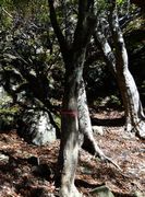 鷹ノ巣山への登山道は,裏英彦山ルートと同じく薬師林道の中にある。林道手前に3〜4台分の駐車スペースがあるが,平日にもかかわらず満車。近年この山の人気が高まってきたので,この駐車場はあてにせず,豊前坊から歩いた方が無難かもしれない。所要時間は5〜10分程度。入口にゲートが下ろされた林道を少し進むと,左手の樹林帯の前に小さな登山口標示が現れるので,ここから細い踏み跡を一の岳へ向かう。 登山道は入口から三の岳まで全体を通して不明瞭なので,枝や幹に巻かれた目印のテープが頼りとなる。 | ||