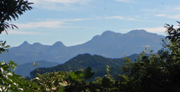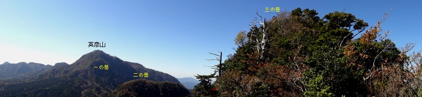 ![]() 山頂展望台から,西に英彦山と鷹ノ巣山の三ピークが並ぶ。