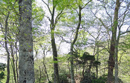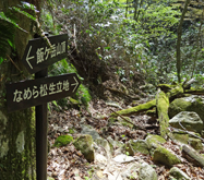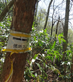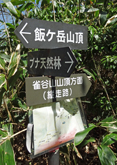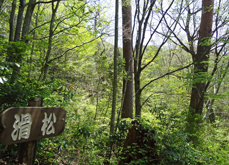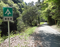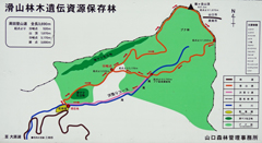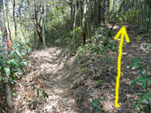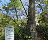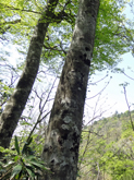 三本杉を過ぎるとさらに急勾配の山道となる。記憶では登山口も近いはずなので,途中のカーブに自転車を置き,歩いて登ることにした。予想どおり,500mくらいで案内板の立つ登山口に到着。木橋を渡って少し上ると,滑松の植林地に出る。前回訪れたのは冬で,下草も木の葉もなかったので,丈の低い幼木まで見やすかったが,この時期はしっかり育った巨木しか判別できない。 |