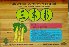 飯ヶ岳周辺の山林は,江戸期には萩藩直轄の用材林「滑御立山」として手厚く保護され,とりわけこの「三本杉」は,毛利家の象徴として大切にされた。樹齢は,案内板の書かれた平成13年時点で推定300年。林道は,三本杉の付近だけ舗装されていた。 |