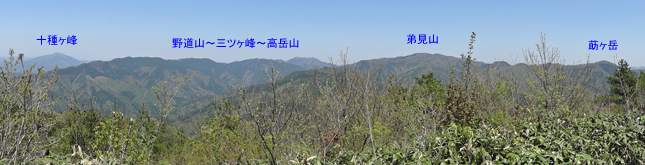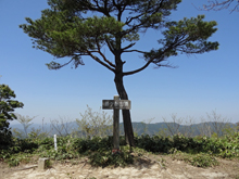 ロープがつけられた急坂を上り切ると山頂に到着。登山口からの所要時間は約45分だった。雲ひとつない晴天だが,黄砂のせいか見晴らしは今ひとつすっきりしない。 |