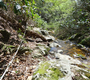 下山路は,来た道の反対側へ下る。下りの途中で,周南市(R315河内峠)からのコースが分岐しており,案内図が木にかけられていたが,実際にはこの道は「滑コース」が開かれて以後荒廃し,藪漕ぎを厭わないマニア向けのルートとなっている。(2015.11に河内峠から登頂を試みたが,途中で踏み跡を見失い引き返す羽目になった) さらに急坂を下り,雀谷山縦走路との分岐から「ブナ天然林」方面に下る。 |