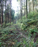 工場の前を過ぎ,右手に分岐する道を見送りまっすぐ進むと,また丁字路の前に出る。左の道に入り数十mで,右に「登り口」の表示があり,山の中に踏み跡が続いている。入口が荒れ気味で不安を感じるが,少し進むと広い作業道に合流する。 |