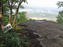 三等三角点の立つ山頂は木に囲まれて見晴らしはない。そのまま進み,表登山道を下っていく。山頂近くにある祠では,かつて干ばつが起きると雨乞いを行っていたという。 よく踏まれた広い道を緩やかに下ってゆくと,5分ほどで「座禅石」に着く。8世紀の僧,法蓮が修行のため座禅を組んだ場所と伝えられ,西側の展望がよい。 |