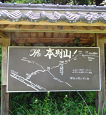 浜田・江津方面から有福温泉に向かい,温泉街入口を素通りしてそのまま県道50号線を進む。上り勾配の道を1.5kmほどで「本明山登山口」「本明自治会館」の看板を見て右の小道に入る。100mほどで本明自治会館。建物の向かい側に駐車スペースがあるので,ここに車を置き登山口へ向かう。200mほど進むと標示板が立つ小さな三叉路に出るので,右折してさらに細い道(舗装路)を「原爆療養所」方面に進む。 200〜300m進むと,左手に本明山の案内板が現れる。現在地から山頂までは片道1935m(案内板による。以下同じ)。案内に従い,左折して田んぼの間の道を登山口に向かう。 |