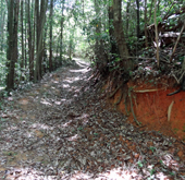 「福田コース」との合流点のすぐ先に最初の鳥居がある。この辺りから道幅が若干狭まり,登山道らしくなってくる。鳥居から330m進むと「不動さんの水」と呼ばれる水場に出る。以前はここに木造のお堂があり不動明王の石像が祀られていたが,現在は建物も石像も残っていない。 2013年の豪雨で流されてしまったのかも。ちょうどお堂の上あたりの道も路肩が崩れ,ロープが張られていた。 |