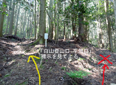 ![]() 小月IC方面から国道491号線を北上し,田部峠にかかる手前の交差点を右折,県道260号線に入り道なりに直進するとやがて県道265号線に変わる。 正面に高畑山と華山を見ながら進み,左手に「平田」バス停を過ごした先に「白山登山道 平田口入口」の標示板が立ち,その先の路肩に2〜3台分の駐車スペースがある。左折して登山道に入っても駐車スペースはなく,すぐに未舗装路となるので,近くの駐車場所はここしかない。 標示から民家の間に入り,正面にそびえる白山に向かって歩いて行くとすぐに未舗装の林道となり,溜池の先で「白山山頂へ1000m」の標示が現れる。 登山道は一部踏み跡が不明瞭なところもあるので,表示類の確認が欠かせないが,木に巻かれたテープには植林用の目印もあるので注意が必要。距離案内板は山頂まで200mおきに立っており,他に分岐や右左折ポイントにも案内標示が立っているので,確認しながら進んで行くようにしたい。 |