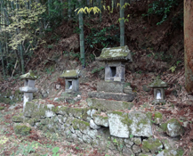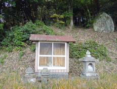 ![]() 建物の横から看板に従い山道に入る。標識類は充分にあり,迷うことなく山道を下って龍頭大明神前に到着。 石段を下り人里に出てからは,両子山登山道に入るまで長い舗装路歩きとなる。(右)画像は龍頭大明神の近くにある尾富寺(おどめじ)跡。 |