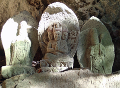 ![]() つづら折りの道を半分くらい下ったところで,トレイルのルートは左手の山中に分岐する「お山めぐり」の道に入り,両子山七不思議に数えられる「鬼の背割り」や「針の耳」といった奇岩をくぐり,岩の間に安置された石仏を見ながら両子寺奥ノ院に下る。いよいよ終点が近い。 |