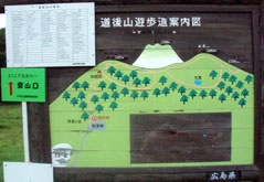![]() 駐車場、トイレが設置された月見ヶ丘。後にそびえるのは道後山の前衛、岩樋山。 案内板によると山頂への道は「遊歩道」。 |