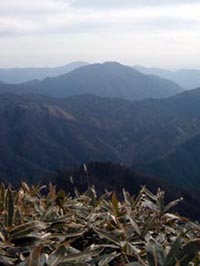 山頂からは北東〜南東にかけての展望が良く,天気の良い日は瀬戸内海に浮かぶ宮島(弥山)まで見渡すことができる。西側は木々が伸びて眺めを遮っているが,その間から安蔵寺山を間近に望むことができる。山頂よりもむしろ北尾根上のピークの方が展望は良いが,山頂からのほぼ平坦な道さえもヤブに覆われており,行くのに躊躇する。容谷山との縦走路を含め,整備されることを願う。 |