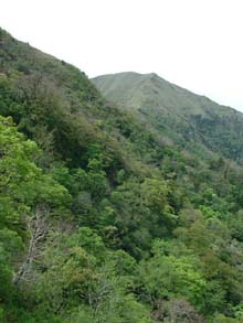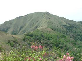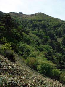 さすが西日本第二の高峰。山頂は遙かに高く、ゴールはまだ遠い・・・ここから先の道は高木がなくなり、傾斜も比較的緩やかとなる。 |