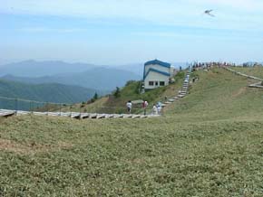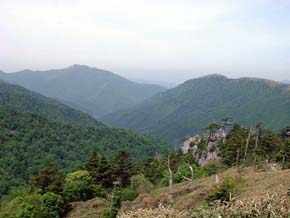 同じ四国・愛媛県の石鎚(いしづち)山(1982m)に次ぐ、西日本第二の高峰。 山上はその名に反し明るい日差しに包まれたなだらかな笹原が広がり、「剣」らしいところは どこにも見あたらない。唯一、山頂手前にそそり立つ「大剣」と呼ばれる巨岩が、いかめしい 表情で登山者を見下ろしている。 この山名は、源平合戦の折り、讃岐国屋島で敗れた平家方の擁する安徳天皇が秘かに阿波国祖谷山 に落ちのび(〜つまり壇ノ浦で入水した天皇は替え玉)、崩御した後に御剣をこの山頂に 埋めご神体としたという言い伝えに由来するもの。 現在は東祖谷山村の見ノ越にある劔神社から山頂を目指す登山道が最も一般的で、マラソンコースも この登山道を利用している。登山道入り口からしばらくは自然林に覆われた木陰の道が続くが、登 山リフト終点の西島からは植生が低木やササに変わり、山頂まで見晴らしの良い道が続く。 (画像は剣山山頂にて。ササに覆われたピークの向こうに次郎笈がそびえ立つ) |