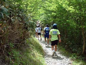 舗装路を約8km登り、トンネルを抜けると、劔神社の石段が待っている。 ここを上りきると、マラソンコースはいよいよ登山道へ。 登山道序盤は、自然林に覆われ暑さはそれほどでもないが、かなりの急坂で まったく走れない。 息を切らしながらひたすら山頂目指して「歩く」。 (左)リフト終点「西島」から剣山山頂を望む。